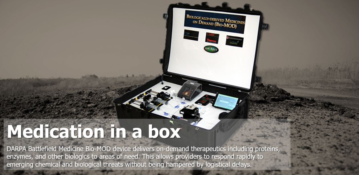 - On Demand Pharmaceuticals’ (ODP) focus is on the production of fine chemical reagents and active pharmaceutical ingredients (APIs), and their technology is based on small-footprint chemical manufacturing devices that were developed in DARPA’s Battlefield Medicine and Make-It programs. Their effort is jointly funded by DARPA and HHS under the CARES Act, and the company enjoyed a visit from FDA Commissioner, Dr. Stephen Hahn, as well as DARPA’s Deputy Director, Dr. Peter Highnam, on 3 December.