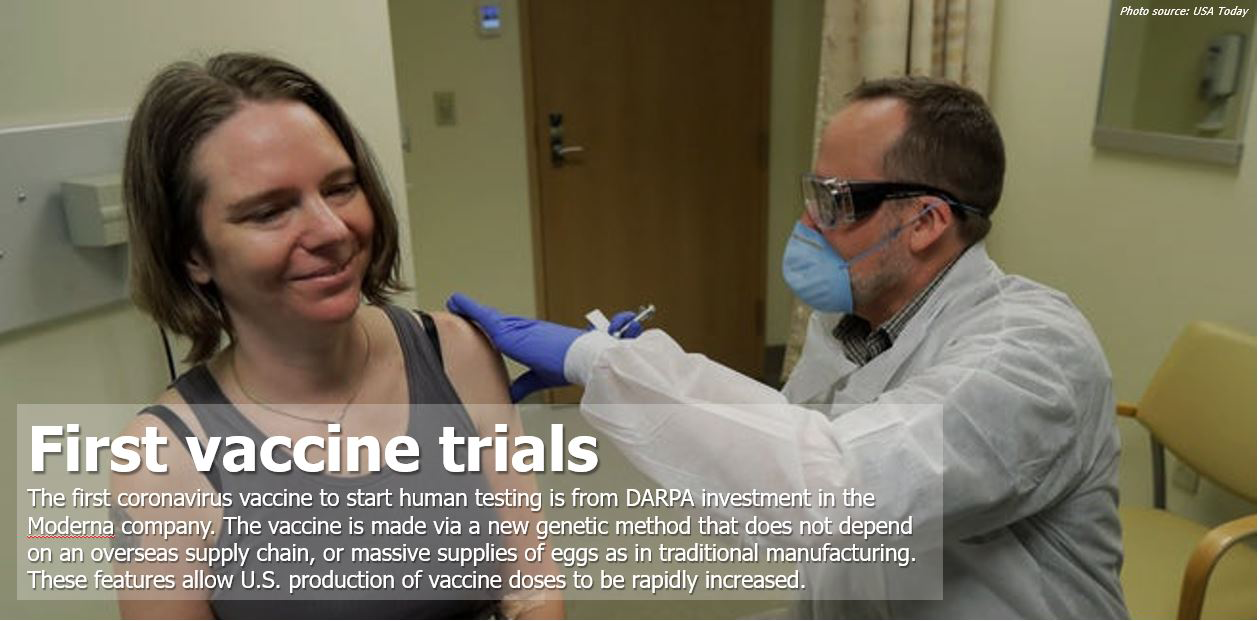 DARPA technology contributes to preventing future COVID-19 infections through novel vaccine technology and more pervasive environmental aerosol monitoring, and to treating the disease through novel antibody treatments, rapid drug discovery, and domestic active pharmaceutical ingredient manufacture.
