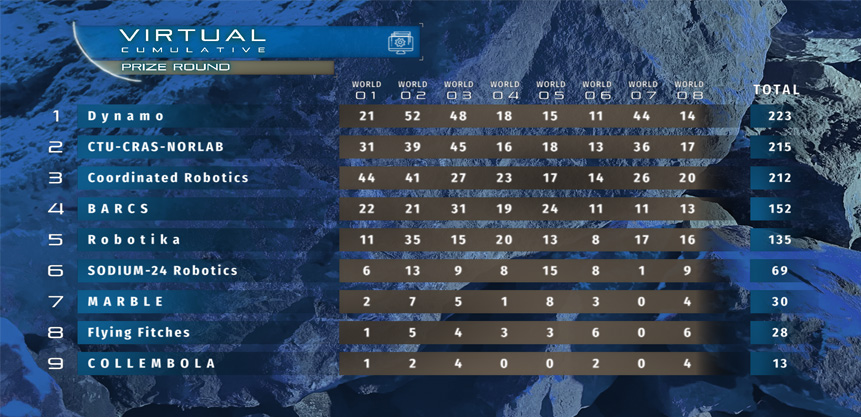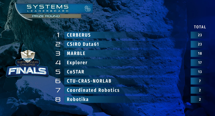 September 24 What an exciting conclusion to the SubT Challenge Final Event! We were able to see Prize Round highlights during a SubTv watch party today before it was announced that CERBERUS won the Systems Competition and Dynamo was victorious in the Virtual Competition, taking home $2 million and $750,000 respectively. Second place in Systems went to CSIRO Data61, which did the last run of yesterday. Though CSIRO Data61 didn't know it at the time, they were up against the already strong score of 23 points racked up by CERBERUS just a few hours earlier. However, as the time clock ticked down, the pace of CSIRO Data61's artifact finds picked up and they also scored 23 points just before time expired! The tie breaker was determined by which team got their last score first during the hour-long run, and that was CERBERUS. MARBLE rounded out the top three with a score of 18 for a $500,000 prize. We also got to see the virtual teams take on the final course. Dynamo, a self-funded team of one, came out on top with a score of 223 in the Virtual Competition with both CTU-CRAS-NORLAB (215) and Coordinated Robotics (212) close behind. The top three Virtual teams were awarded $750K, $500K, and $250K respectively. Humans on the teams also got a chance to go into the course and explore the areas only their robots had seen until today. The final leaderboards are below. Leaderboards |
